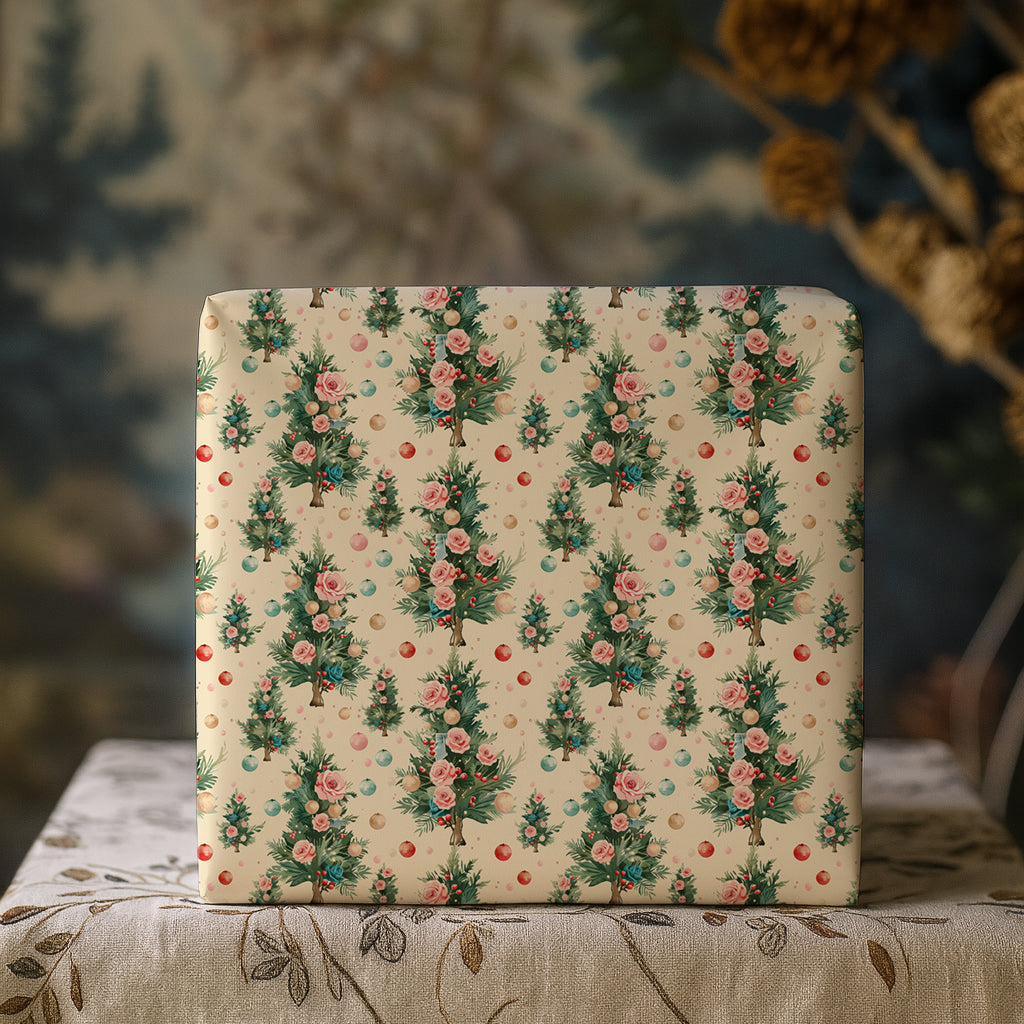 Wrap your gifts in timeless elegance with this stunning antique-inspired wrapping paper featuring delicate roses nestled among classic Christmas trees and pastel baubles. Perfect for creating a vintage holiday aesthetic, this design brings a touch of nostalgic charm to every present. Mix and match with complementary papers to craft a curated gift-giving experience that feels both sophisticated and festive. Ideal for anyone who loves botanical details and classic holiday traditions with a refined twist.