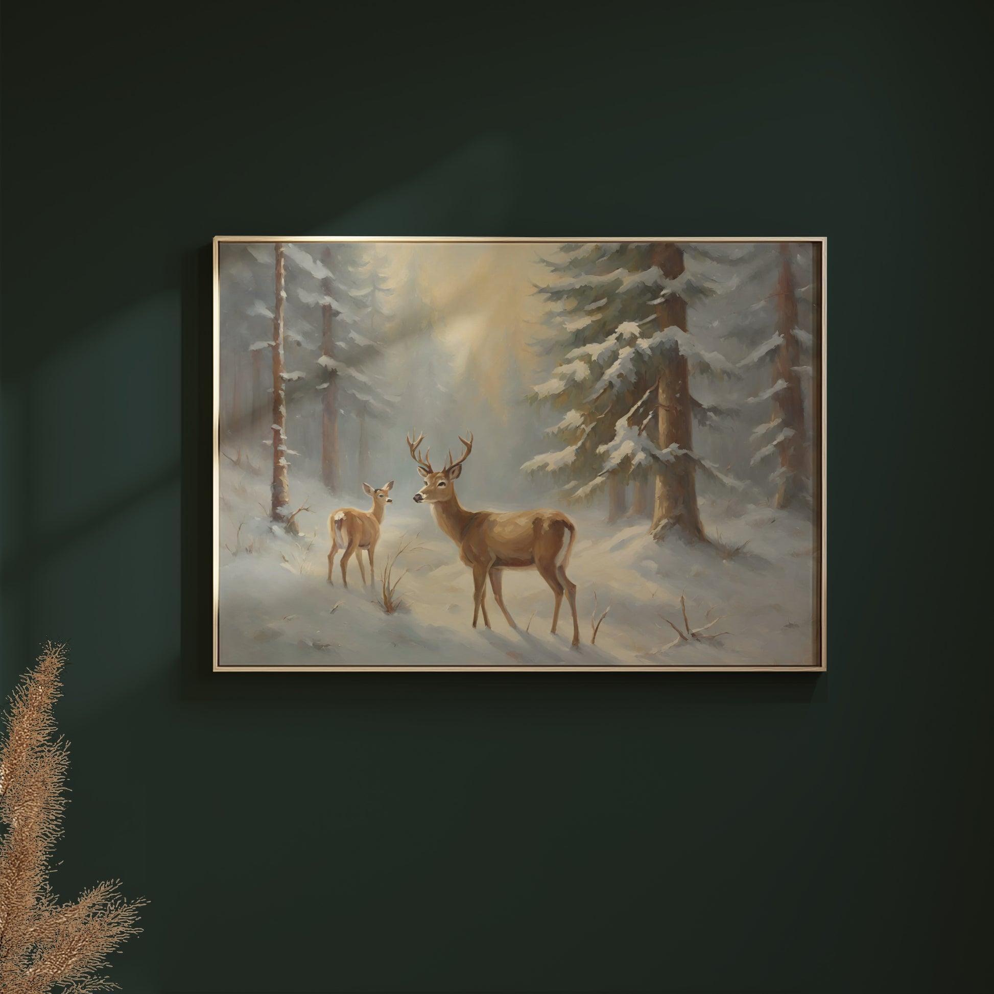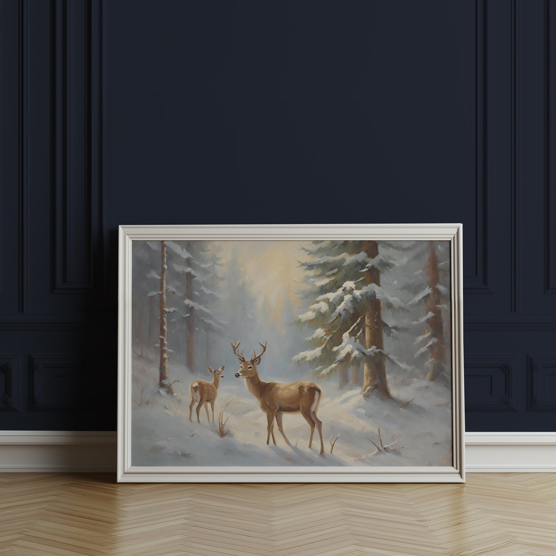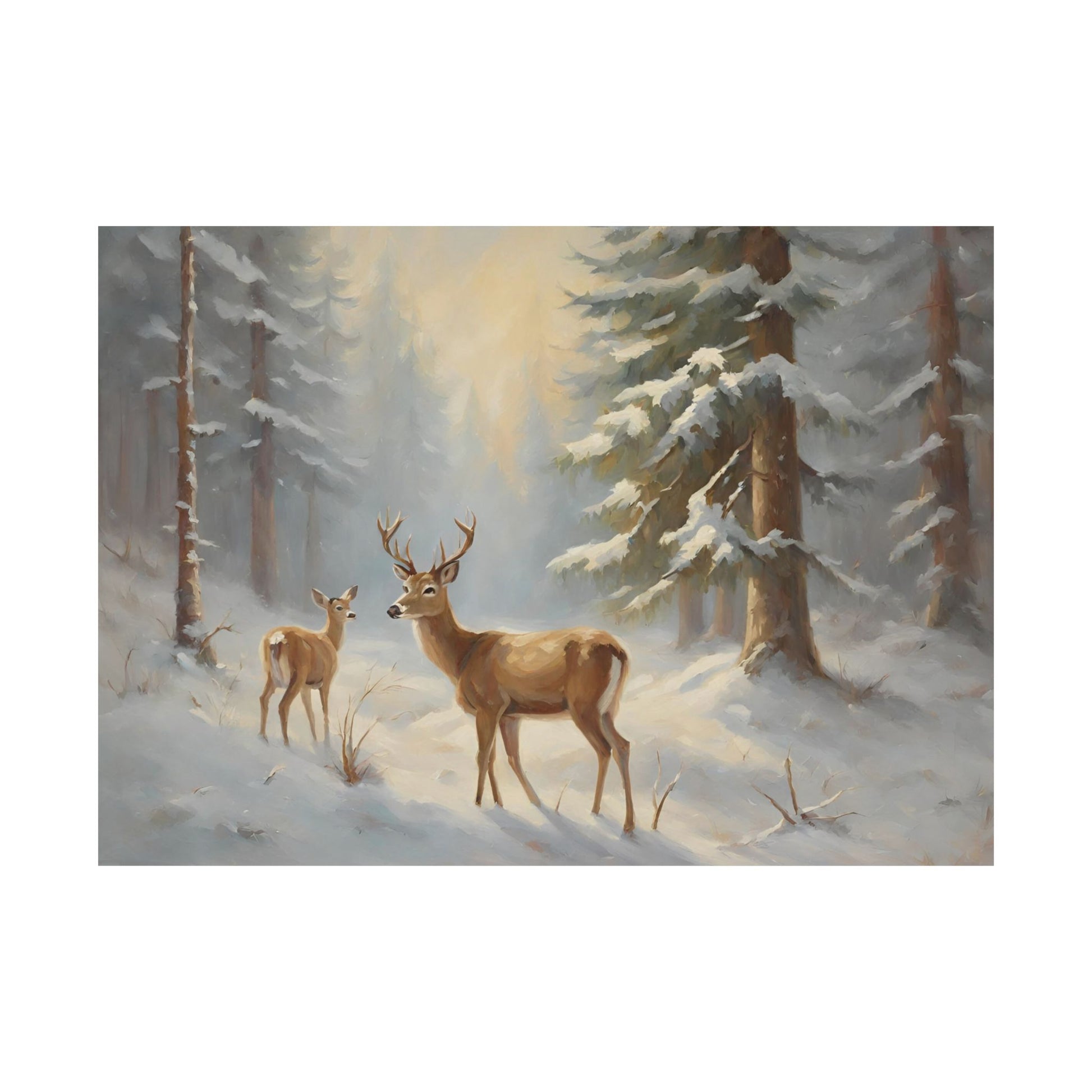 Bring the magic of a snowy forest right into your home with this charming buck and doe poster art print. Perfect for creating that cozy cabin aesthetic, this winter scene captures the beauty of wildlife nestled among frosted fir trees. Whether you're decorating for the holidays or adding year-round rustic charm to your space, this matte horizontal print makes a thoughtful gift or a delightful personal treasure. Ideal for living rooms, dens, or anywhere you want to escape to nature's peaceful embrace.