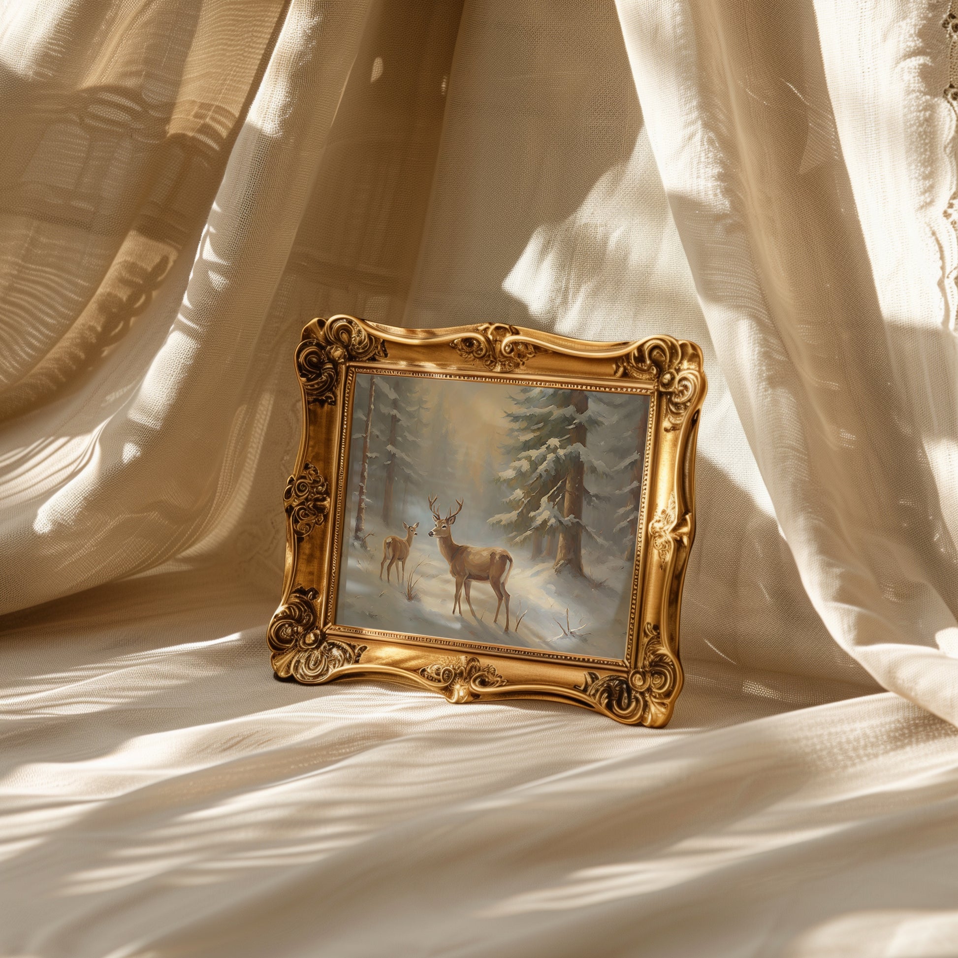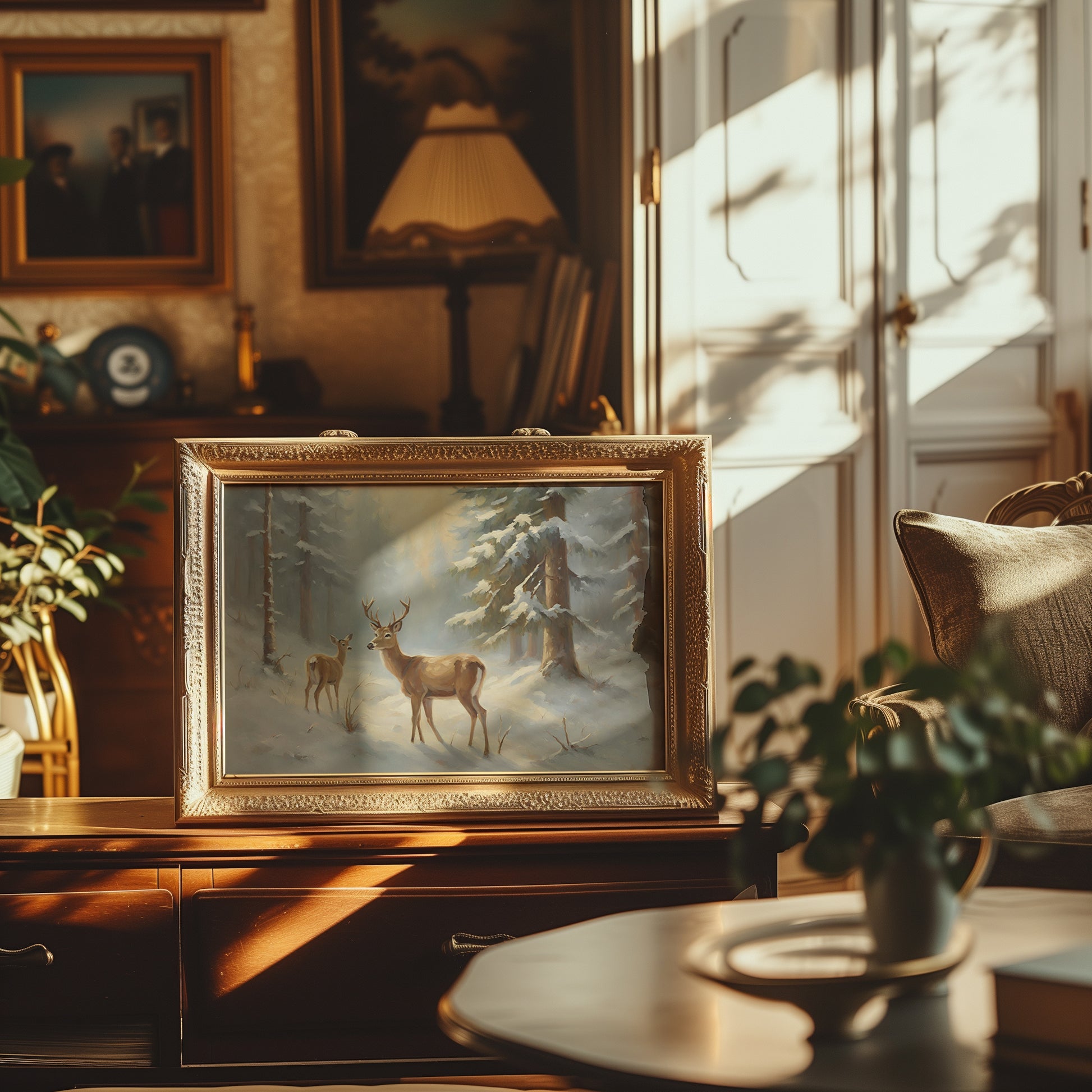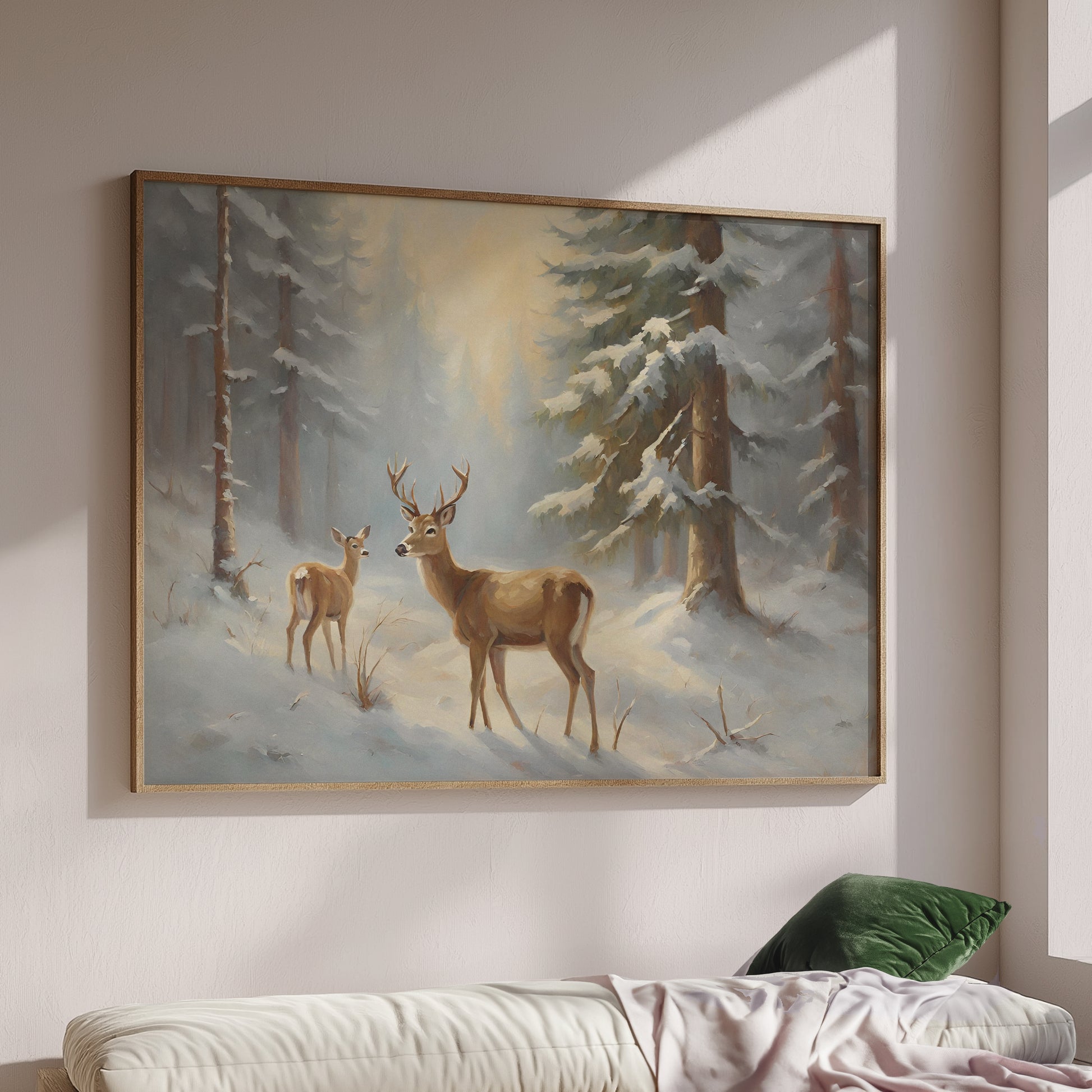 Bring the magic of a snowy forest right into your home with this charming buck and doe poster art print. Perfect for creating that cozy cabin aesthetic, this winter scene captures the beauty of wildlife nestled among frosted fir trees. Whether you're decorating for the holidays or adding year-round rustic charm to your space, this matte horizontal print makes a thoughtful gift or a delightful personal treasure. Ideal for living rooms, dens, or anywhere you want to escape to nature's peaceful embrace.