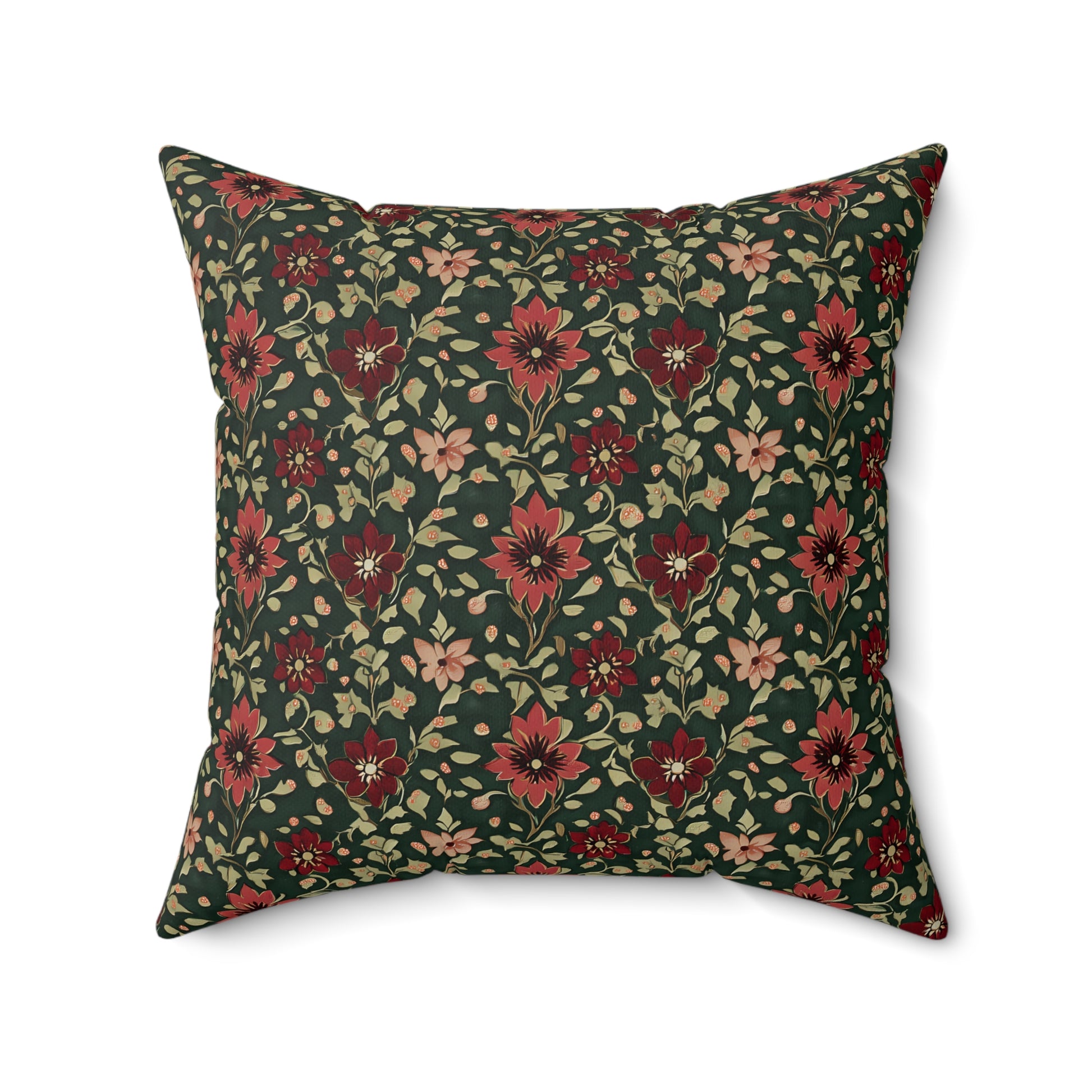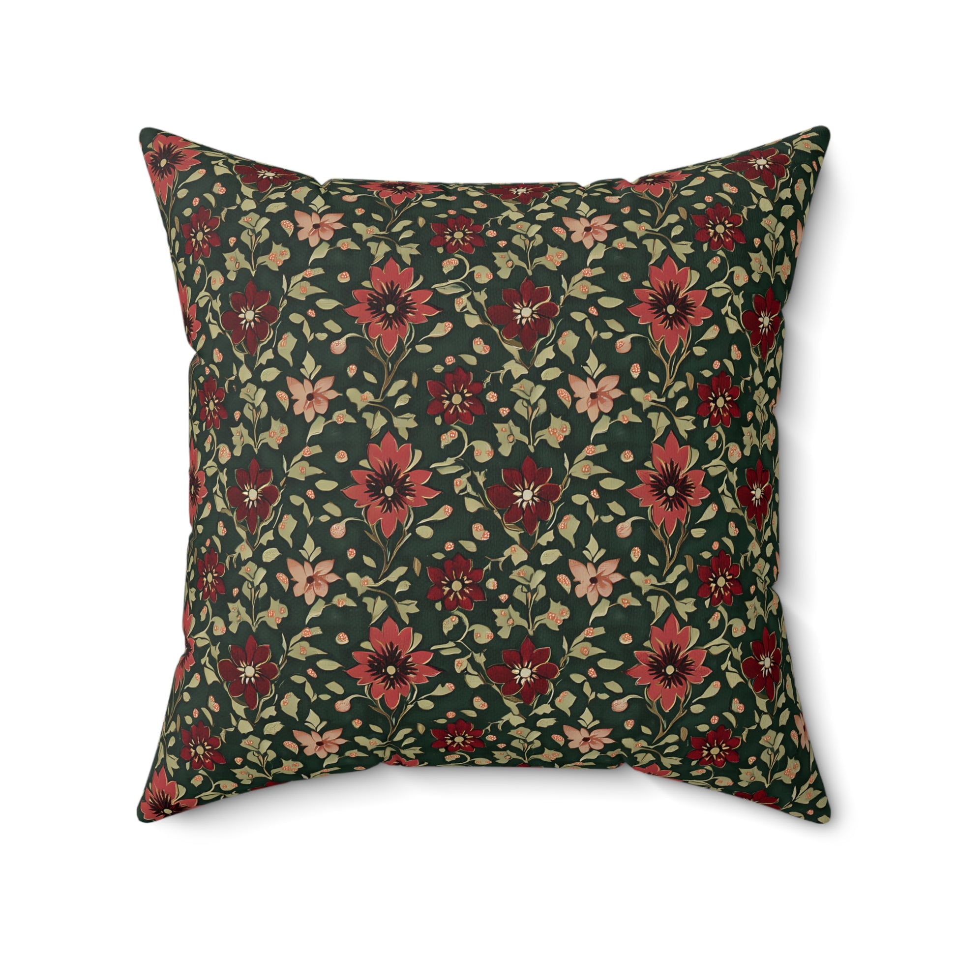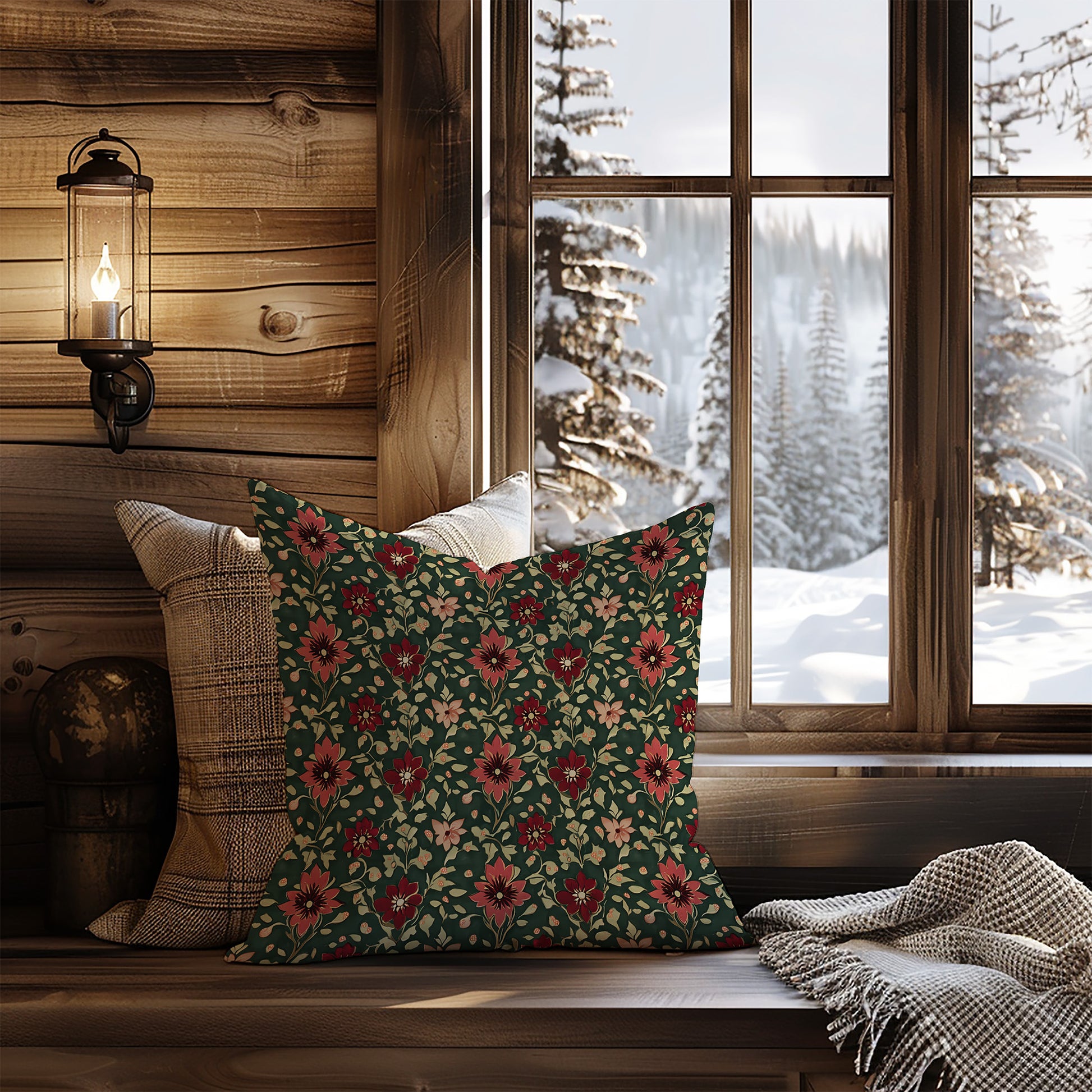 Burgundy Red and Green Dark Holiday Floral Square Throw Pillow
