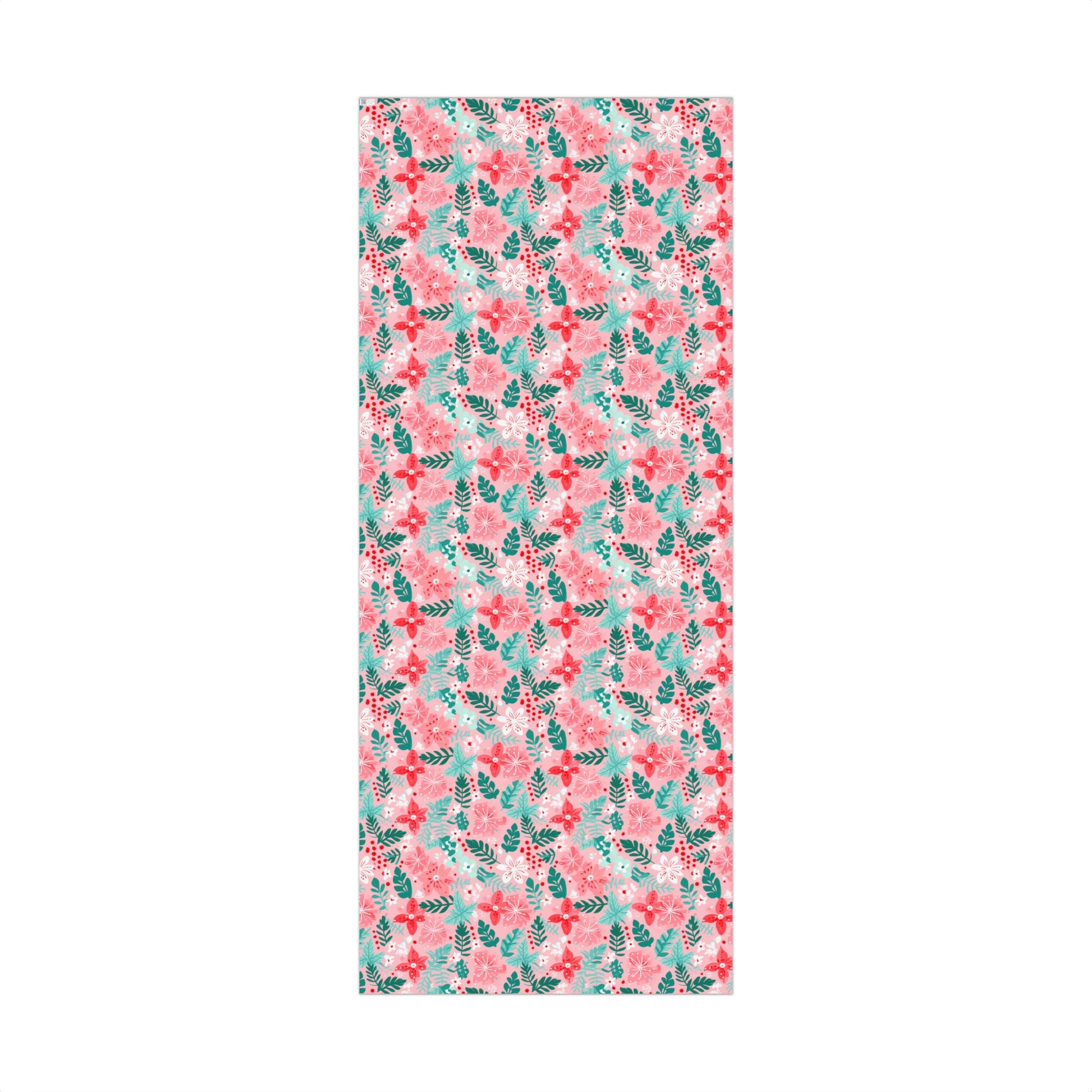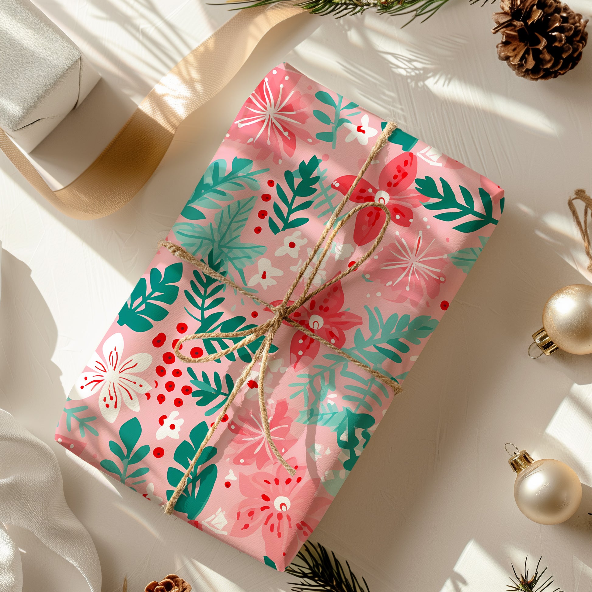 Cozy Christmas Pink, Red and Green Floral Poinsettia and Fir Gift Wrapping Paper Sheets