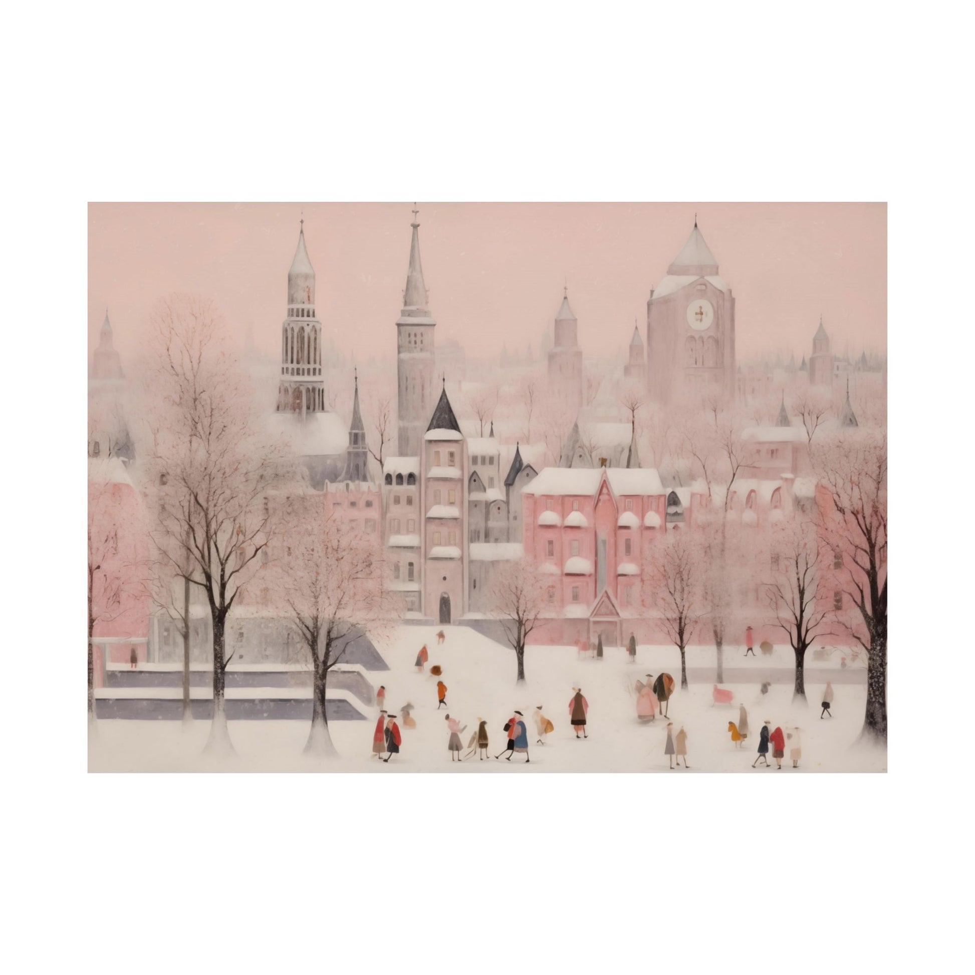 Pink Holiday Town Whimsical Winter Scene Matte Horizontal Poster Art Print