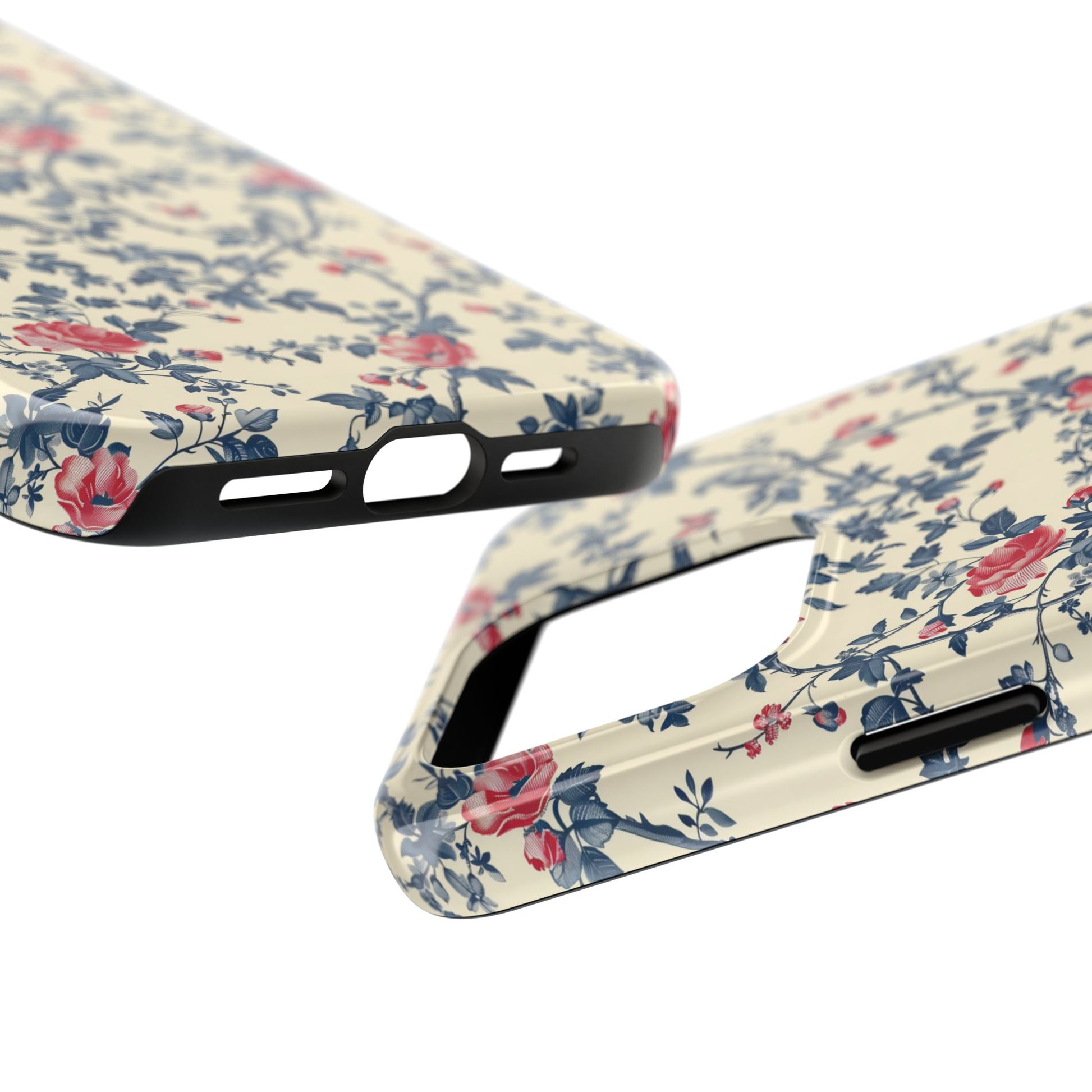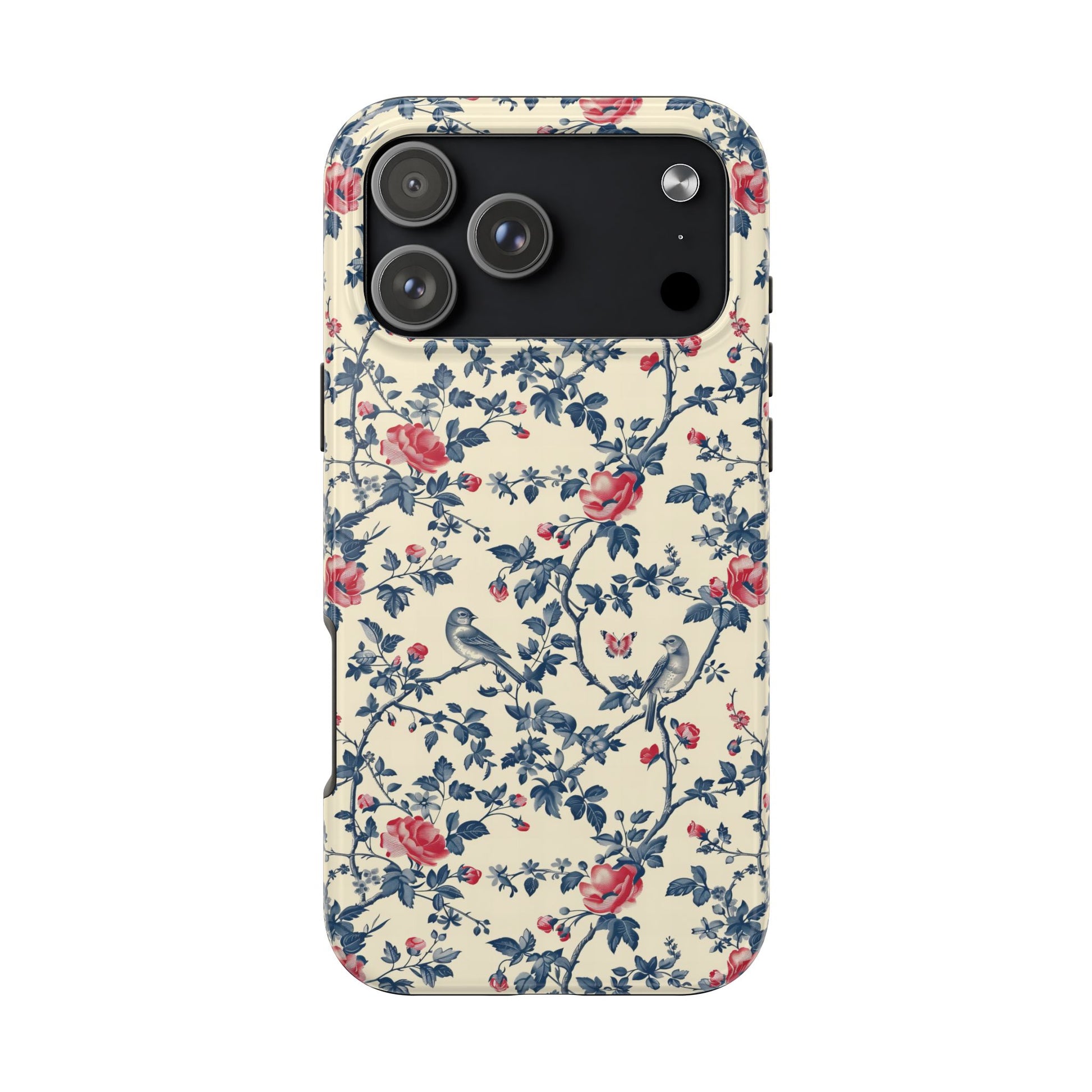 Bring timeless charm to your everyday tech with this stunning Toile de Jouy phone case. Featuring delicate red birds and blue florals in a classic vintage pattern, it captures that coveted antique aesthetic with French or Victorian elegance. This tough protective case keeps your phone safe while making a sophisticated style statement. Perfect whether you're treating yourself or gifting it to someone who appreciates the finer details—because protecting your phone shouldn't mean sacrificing beauty.
